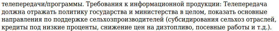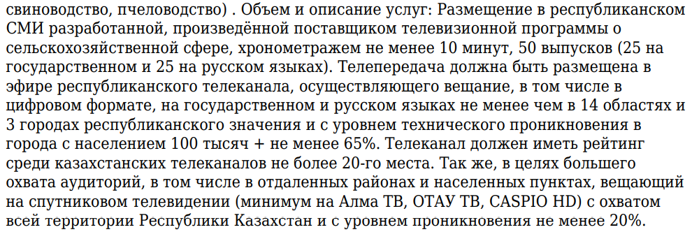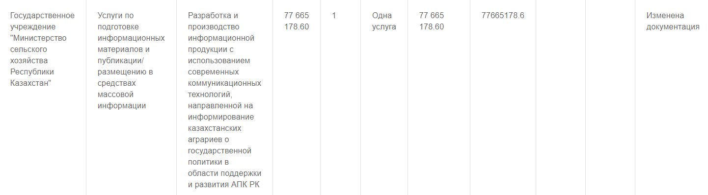 В 2020 году государственное учреждение "Министерство сельского хозяйства Республики Казахстан" опубликовало тендер по закупке услуг по подготовке информационных материалов в СМИ для информирования казахстанских аграриев о проводимой госполитике. На эти нужды было выделено 77 665 178 тенге. Сейчас лот находится на стадии изменения документации, но все еще не отменен.