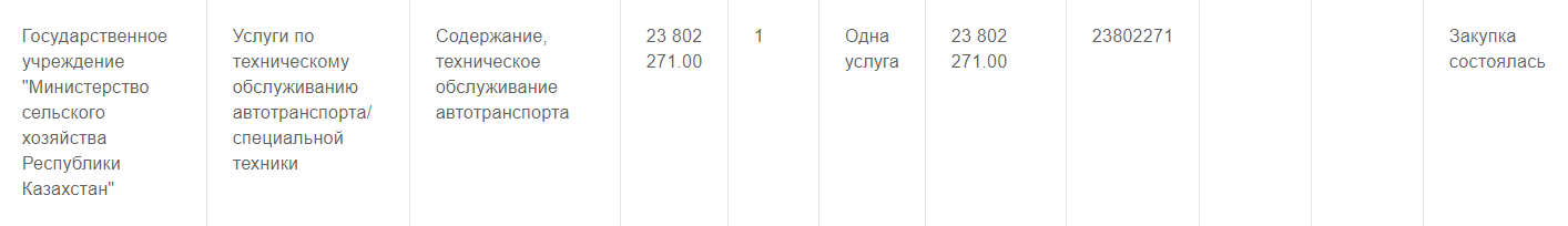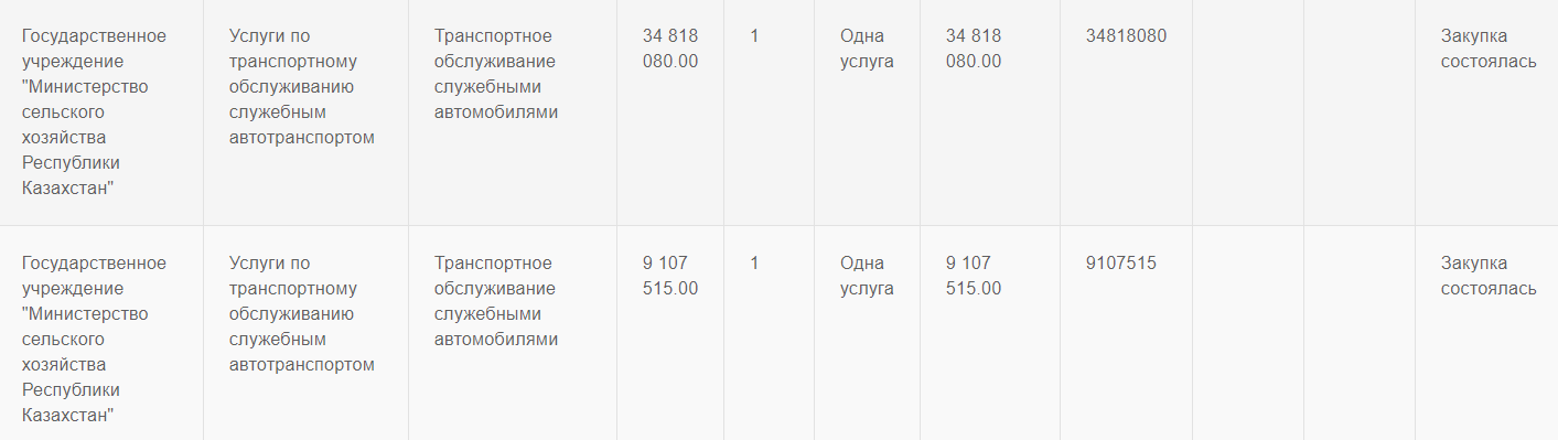 Кроме того, организация не жалеет денег для обеспечения своих сотрудников служебным автотранспортом. В конце 2020 года минсельхоз разместил сразу два лота на закупку услуг по обслуживанию служебным автотранспортом. Первый лот обошелся госбюджету в 34 818 080 тенге, а второй — в 9 107 515 тенге. Общая сумма составила 43 925 595 тенге.
