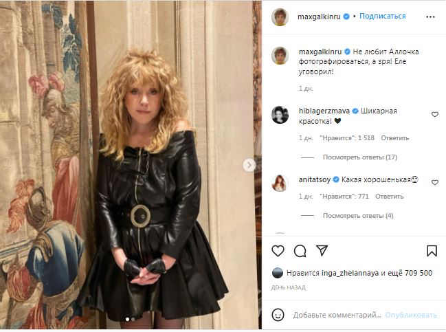 72-летняя примадонна на снимке предстала в смелом образе — кожаном мини-платье и спущенными плечами, чем вызвала неоднозначную реакцию подписчиков мужа — одни восторженно отмечали, как здорово Алла Борисовна выглядит в свои годы, а другие оставили едкие комментарии.