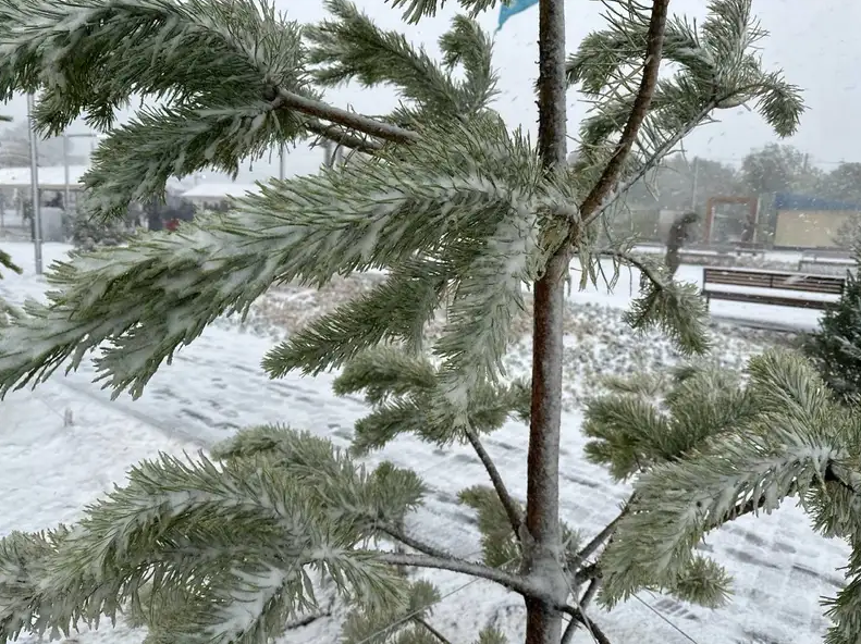 Корреспондент Zakon.kz делится фото и видео последствий непогоды. На кадрах видно, как на фоне густой зелени обильно падает снег.