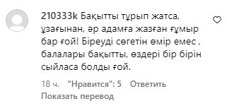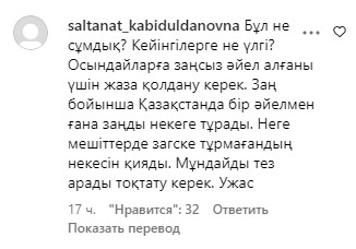 "Это что за ужас? Какой пример подаете подрастающему поколению? Нужно наказывать таких, кто незаконно женится на нескольких женщинах. По закону в Казахстане мужчина живет только с одной женой. Почему в мечетях позволяют проводить "никях" на не зарегистрированные браки? Такое надо поскорее пресечь. Ужас" — пишет пользователь saltanat_kabiduldanovna.