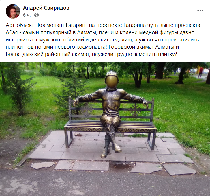 "Арт-объект "Космонавт Гагарин" на проспекте Гагарина чуть выше проспекта Абая — самый популярный в Алматы, плечи и колени медной фигуры давно истёрлись от мужских объятий и детских седалищ, а уж во что превратились плитки под ногами первого космонавта! Городской акимат Алматы и Бостандыкский районный акимат, неужели трудно заменить плитку?" — пожаловался участник городского паблика Андрей Свиридов.