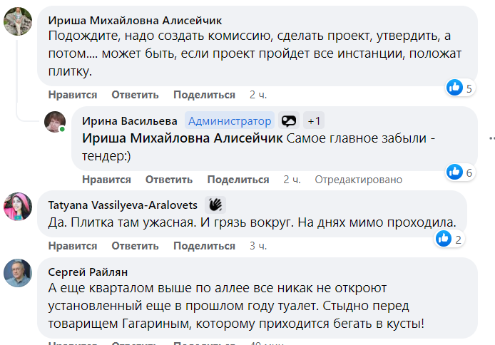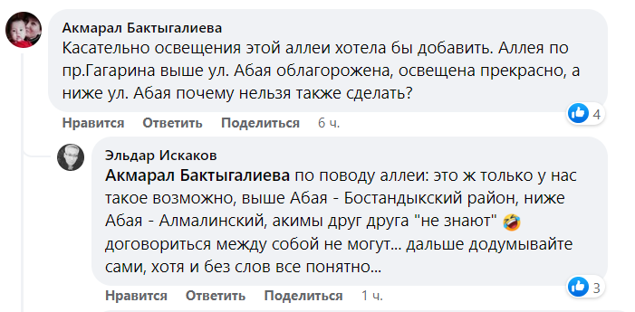 "Касательно освещения этой аллеи хотела бы добавить. Аллея по пр.Гагарина выше ул. Абая облагорожена, освещена прекрасно, а ниже ул. Абая почему нельзя также сделать?", " Да. Плитка там ужасная. И грязь вокруг. На днях мимо проходила", "Действительно, это наша история, история всего человечества. Мы, взрослые, и наши дети должны знать, кто первый совершил полет в космос И для эстетики необходимо облагородить это место. У нас много туристов, местные жители, все хотят видеть наш город красивым и ухоженным", — пишу жители мегаполиса в комментариях.