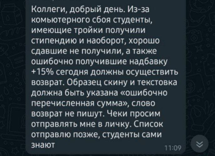 В посте опубликовали скриншот с сообщением, который получили студенты, получившие во втором семестре тройки, однако по ошибке получившие стипендии в отличие от тех, кто сдал экзамены на более высокие оценки. Утверждается, что это происходит в Кокшетауском университете им. Шокана Уалиханова.