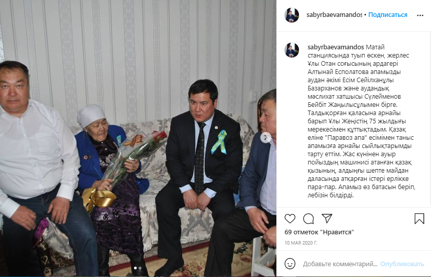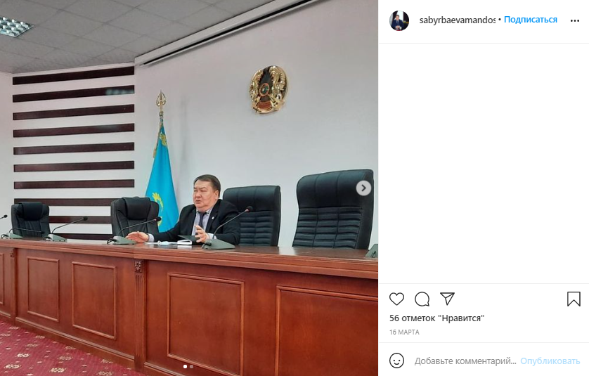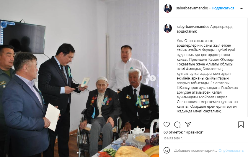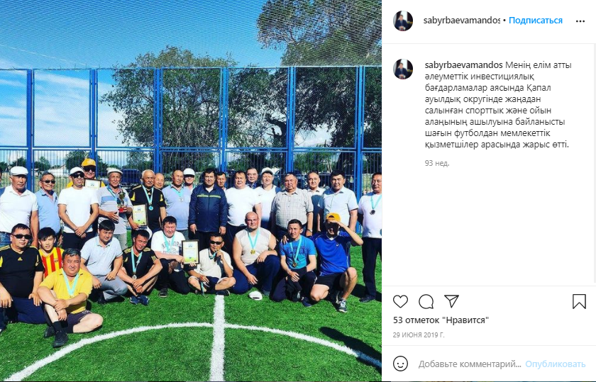 Стоит отметить, что из трех госслужащих аккаунт в соцсетях регулярно обновляет только глава семейства — Амандос Акишевич Сабырбаев. На своей странице в Instagram он регулярно выкладывает фотоотчеты о прошедших встречах как с населением, так и с подчиненными. Примечательно, что на большинстве снимков он запечатлен без маски.