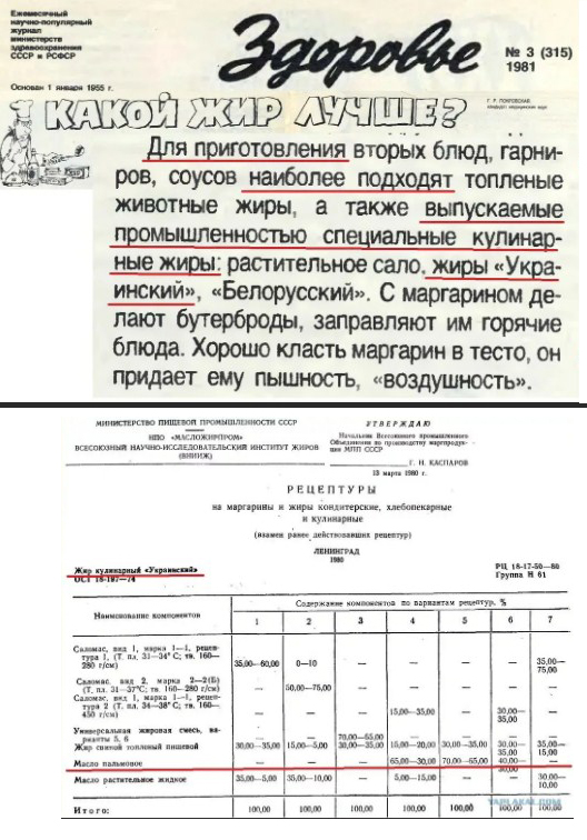 Кстати, наличие растительного жира в составе продуктов совсем не означало, что в ход шло подсолнечное масло. То самое пальмовое масло, от которого сейчас все воротят нос, в советских продуктах было далеко не редкостью. В статистическом отчете планово-экономического отдела при министерстве торговли СССР открыто говорится, что в 1963-м только в Индонезии было закуплено 2 млн 330 тыс тонн пальмового масла. В 1964-м обьем поставок увеличился еще на 114 тысяч тонн. Причём полвека назад пальмовое масло было в разы хуже нынешнего. В такой стране как Индонезия, хорошо его очищать попросту не умели.