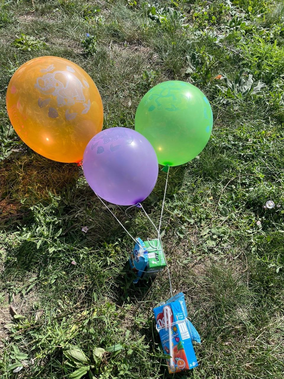 В посте выложили фотографии воздушных шариков, к которым привязаны упаковки сока и сладости.