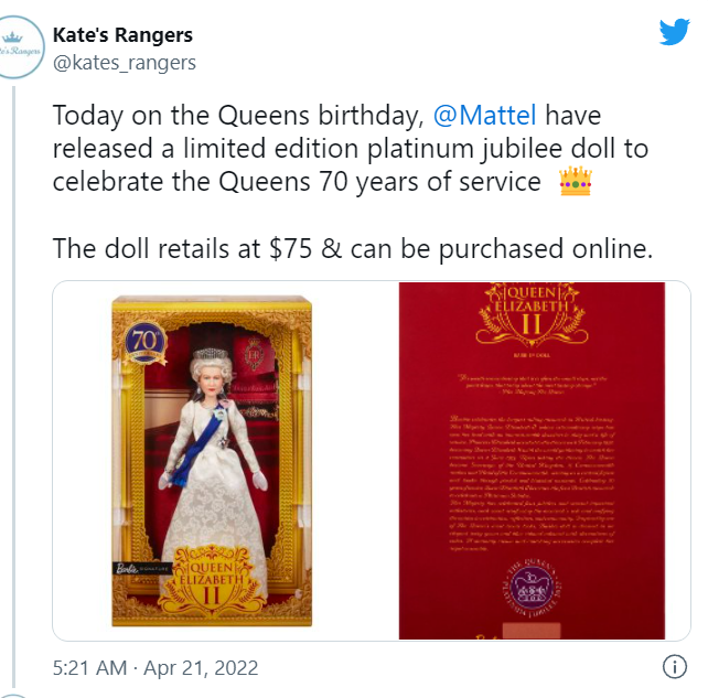 Представив новю куклу, Mattel, таким образом, хотела поздравить британского монарха с юбилеем восшествия на престол. В 2022 году исполнилось 70 лет с тех пор, как Елизавета II стала королевой.