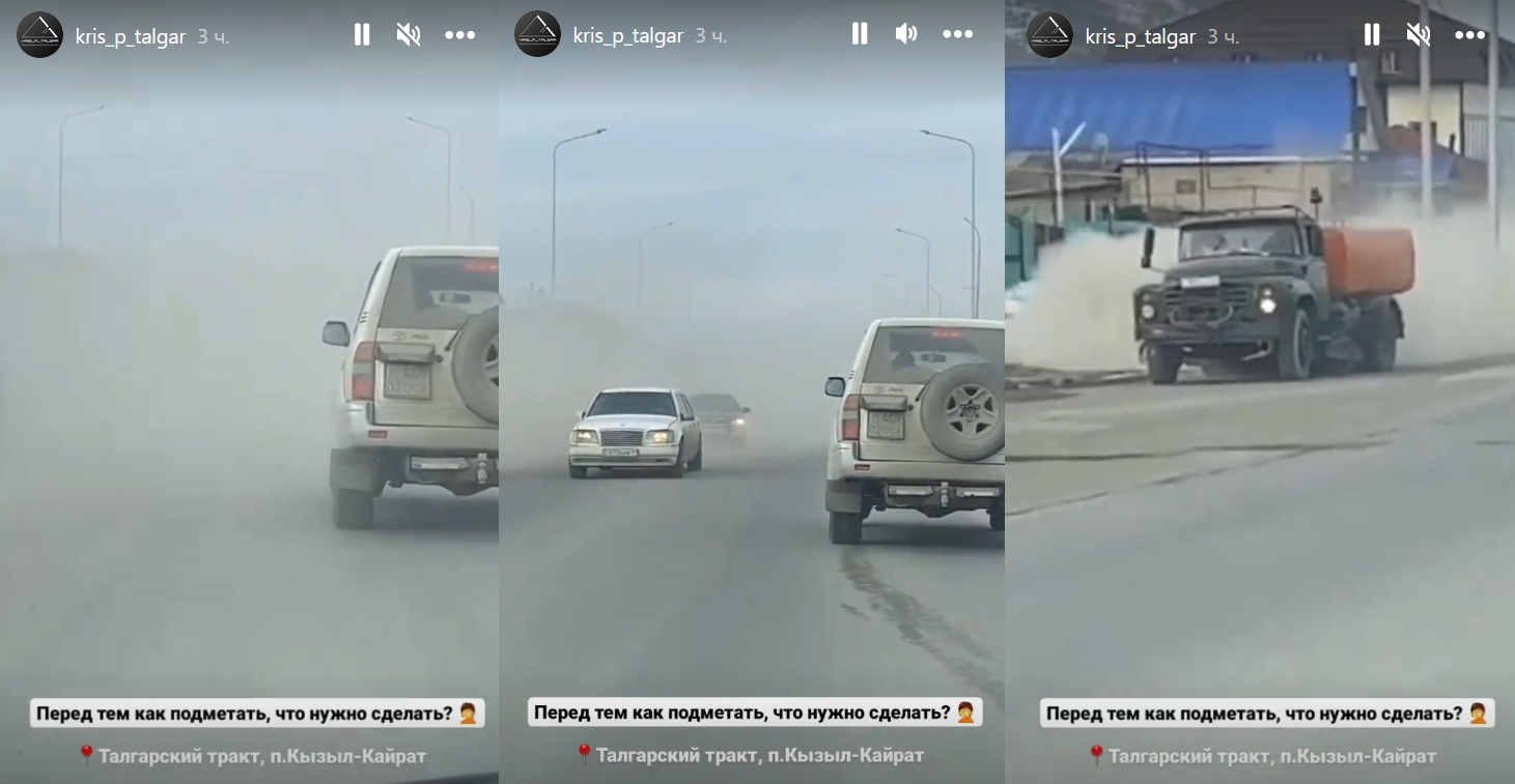 Водителям, которые ехали вслед за спецмашиной, пришлось передвигаться в условиях пониженной видимости, передает медиа-портал Сaravan.kz. В ролике показан участок тракта в поселке Кызыл-Кайрат. Сначала видно автомобили, едущие по дороге в облаке пыли, далее в кадре появляется уборочная машина, поднимающая эту пыль.