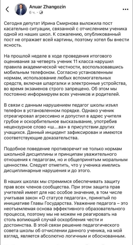 «Как можно исключить ребёнка из школы 23 мая? Куда он пойдёт? Какая школа его примет? Школа, не кажется ли вам, что вы нарушаете права ученика? Не кажется ли вам ваше скоропалительное решение незаконным? Не демонстрируете ли вы свой уровень компетенции ниже, чем ожидание общества? Общественность готовится для обращения в суд, защищая права ребёнка», — написала в Facebook депутат мажилиса Ирина Смирнова.