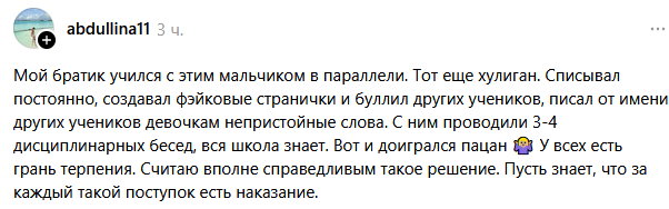 Мнения разделились. Те же, кто поддерживают Сункара, считают, что нельзя ломать мальчику жизнь из-за одной ошибки и заставлять его тратить еще год на повторное обучение в 11 классе, так как сейчас он не сможет перевестись в другую школу и сдать экзамены.
