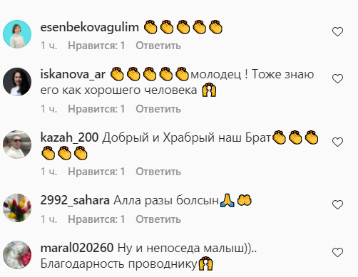 "Это не жалоба, а благодарность проводнику поездаТальго Машенову Кадыржан Алжаппарулы. Моя мама с моим сыном выезжали с города Чу в Нур-Султан и при проверке документов мой сын забежал в поезд и выбежал через другой вагон. Мама не успела среагировать, побежала его искать а в это время он спустился к рельсам где двигался другой состав поезда. Проводник быстро среагировал, выбежал с вагона побежал к нему и спас моего сына. Хочу выразить огромную благодарность этому человеку за смелость! ", — говорится в публикации.