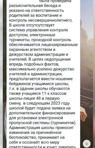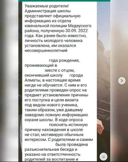 Спустя какое-то время появился ответ от администрации школы, в котором утверждается, что личность неожиданного посетителя установлена, и что с ним и его родителями провели разъяснительную беседу полицейские: