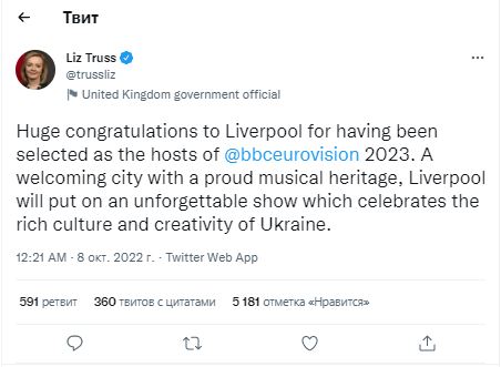 — Большие поздравления Ливерпулю, выбранному в качестве города, который примет "Евровидение" в 2023 году, — написала политик.