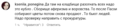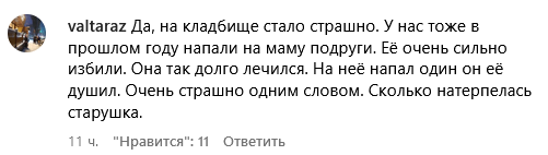 "Сегодня случай был, моя соседка, женщина 45 лет, была на кладбище Зеленый ковер, поправляла могилку. К ней подошли незаметно и толкнули, отобрали сумку, где находились телефоны, деньги. Она обратилась к охране кладбища, объяснила ситуацию, они сказали, это не первый случай, камер нет. Она попросила на проезд и приехала ко мне, попросила заблокировать карты. И поехала писать заявление.