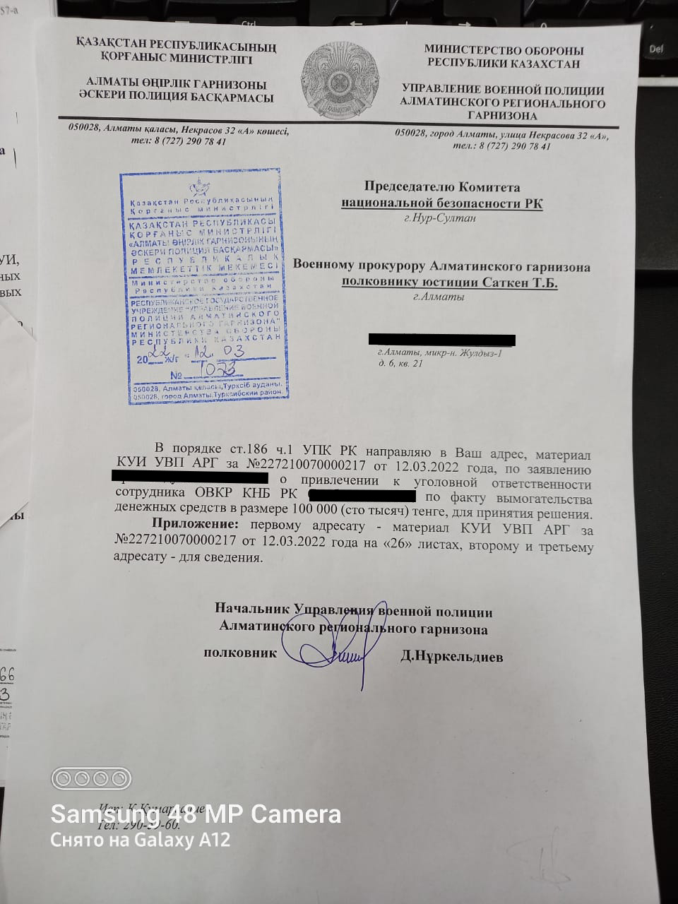 Стали известны фамилии работников спецслужб, которые вымогали деньги у командиров воинских частей на постоянной основе. После выхода статьи в «Караване» на одного из них, сотрудника ОВКР КНБ А.С. ,материал на 26 листах уже направлен председателю КНБ «для возбуждения уголовного дела и принятия неотложных мер».