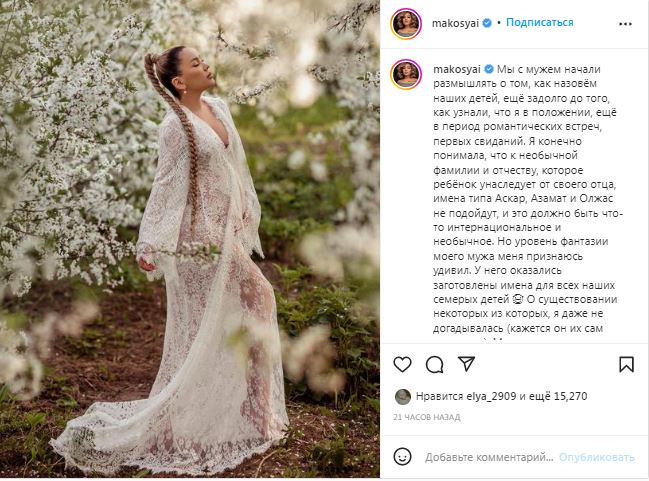 — Мы с мужем начали размышлять о том, как назовем наших детей, еще задолго до того, как узнали, что я в положении, еще в период романтических встреч, первых свиданий. Я, конечно, понимала, что к необычной фамилии и отчеству, которые ребенок унаследует от своего отца, имена типа Аскар, Азамат и Олжас не подойдут, и это должно быть что-то интернациональное и необычное. Но уровень фантазии моего мужа меня, признаюсь, удивил. У него оказались заготовлены имена для всех наших семерых детей. О существовании некоторых из них я даже не догадывалась (кажется, он их сам придумал), — написала певица.