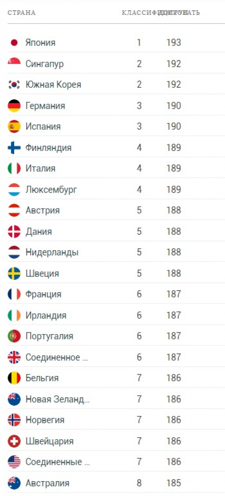 Япония возглавила рейтинг, предложив своим гражданам безвизовый режим или визу по требованию в 193 страны. Следующие две страны, Сингапур и Южная Корея, предлагают 192 пункта назначения без визы.
