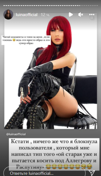 А спустя какое-то время написала в сториз: "Кстати, ничего же, что я блокнула пользователя, который мне написал типа того: "Ой, старая уже и пытается косить под Аллегрову и Распутину".