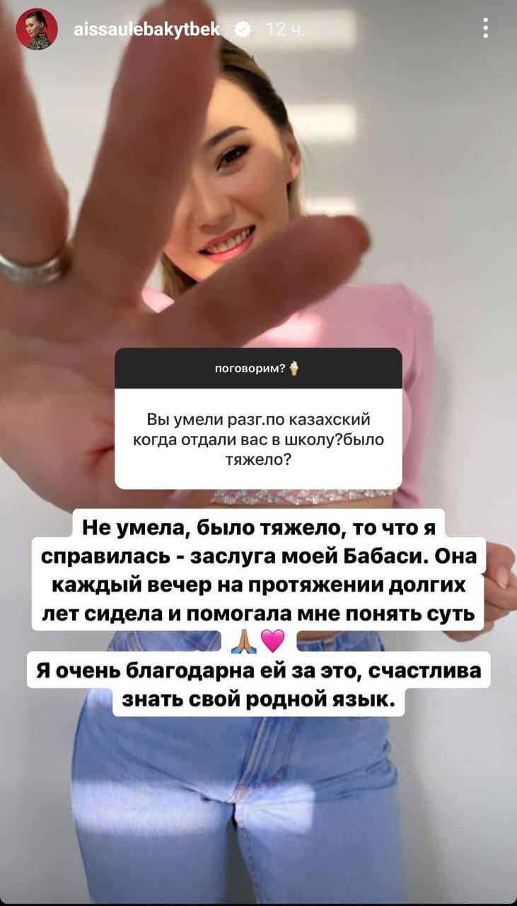 "Не умела, было тяжело, то, что я справилась, — заслуга моей Бабаси. она каждый вечер на протяжении долгих лет сидела и помогала мне понять суть. Я очень благодарна ей за это. счастлива знать свой родной язык", — рассказала в ответ Айсауле.