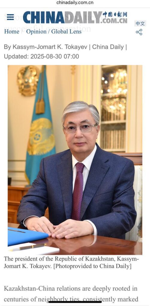 Сегодня в популярной англоязычной китайской газете China Daily опубликована статья президента Касым-Жомарта Токаева «Strong Kazakh-Sino ties key to successful cooperation» («Прочные казахско-китайские отношения — ключ к успешному сотрудничеству»), которая посвящена развитию всестороннего стратегического партнерства между Казахстаном и КНР, а также укреплению потенциала Шанхайской организации сотрудничества, сообщает Caravan.kz.