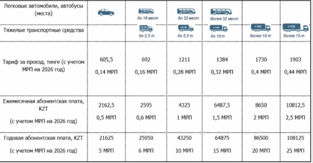Для других категорий транспорта стоимость также увеличится пропорционально: например, для автобуса до 16 мест проезд будет стоить 0,16 МРП – 692 тенге.