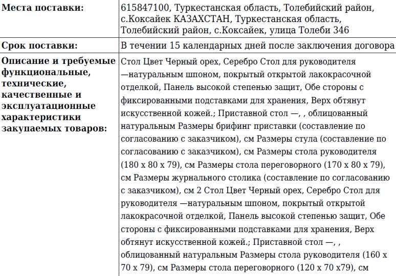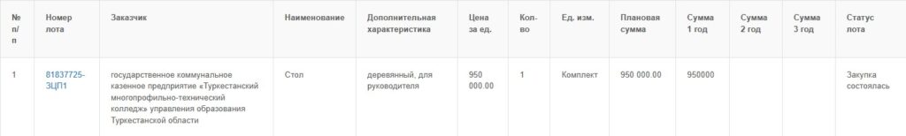 Туркестанский многопрофильный технический колледж приобрел деревянный стол для руководителя за 950 тысяч тенге.