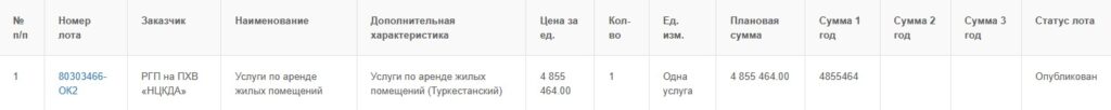 Филиал Республиканского государственного предприятия на праве хозяйственного ведения «Национальный центр качества дорожных активов» по Туркестанской области готов потратить почти 5 млн тенге на аренду квартиры в Шымкенте. За год получается 4 855 464 тенге, или 404 622 тенге ы месяц.