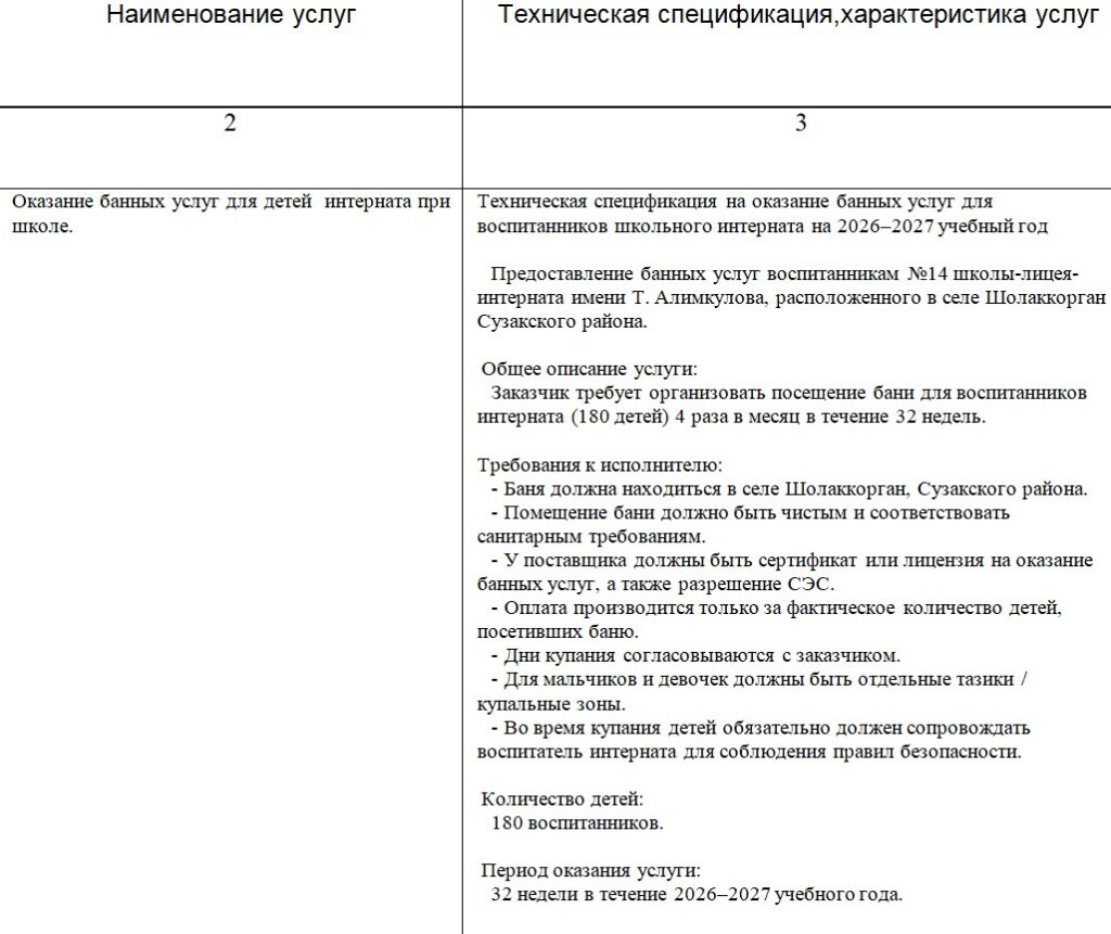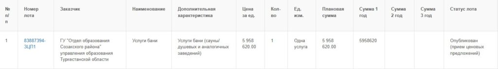 На фоне всего этого комфорта особенно выделяется закупка услуг бани для 180 воспитанников школы-лицея-интерната в селе Шолаккорган. Судя по спецификации, банный день у детей должен быть раз в неделю или 4 раза в месяц.