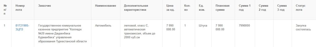 Отличился и другой колледж – на этот раз № 20 имени Дауренбека Курманбека. Это учреждение купило легковой автомобиль 2025 года выпуска почти за 8 млн тенге.