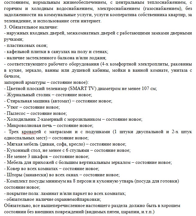 Основные требования к квартире следующие: трехкомнатная, в доме не старше 2020 года, чистая, с мебелью и техникой. Выглядит так, словно там будет жить гостеприимная семья, поэтому им нужны и двуспальная кровать, и сервиз на 8 персон, и 6 стульев к кухонному столу.