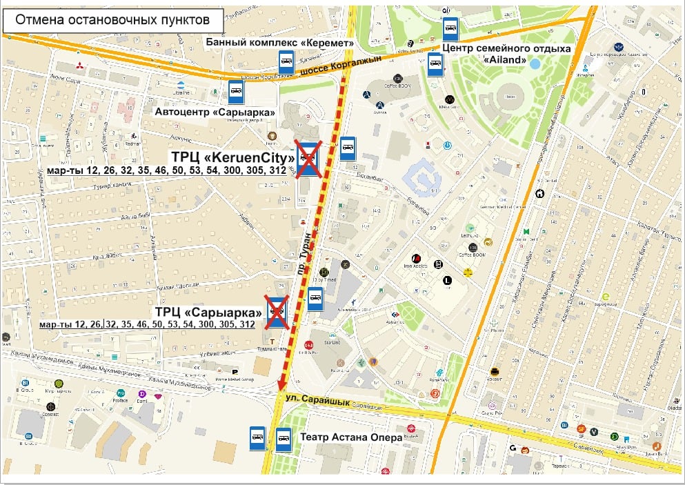 Столичные автобусы временно перестанут останавливаться на остановке "Сарыарка" и KeruenCity по проспекту Туран, сообщает Caravan.kz со ссылкой на City transportation systems.