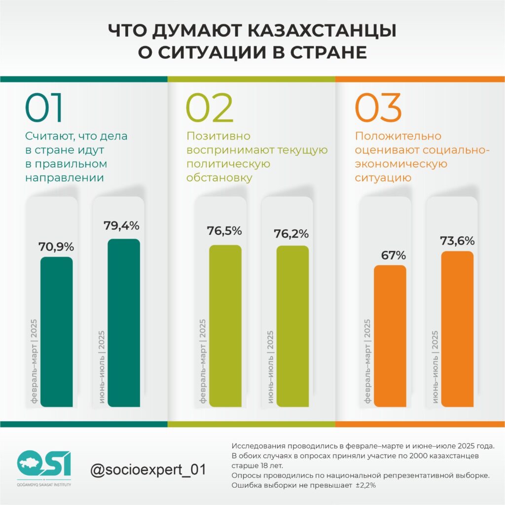 Это свидетельствует о сохраняющемся общественном консенсусе относительно выбранного курса и устойчивости социальных настроений, сообщает Caravan.kz. Большинство респондентов (79,4%) считают, что страна движется в правильном направлении.