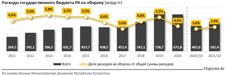 К примеру, согласно данным finprom.kz, из общего объема расходов госбюджета в размере почти 14 трлн тенге за десять месяцев 2021 года на оборону пришлось лишь 542,4 млрд тенге, или 3,9%. Если рассматривать многолетнюю динамику, то и без того низкая доля расходов на оборону не растет, а варьируется на уровне 4%-5,5%. Причем в 2020 году она значительно снизилась. Были также зафиксированы случаи, когда доля расходов на оборону составляла и менее 4%.