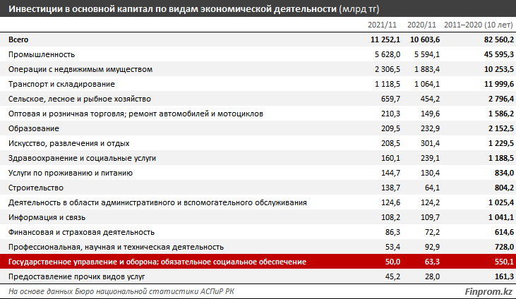 Факт недостаточного финансирования обороны подтверждает и объём инвестиций. По сравнению с другими отраслями на оборону, госуправление и соцобеспечение выделяется меньше всего средств. За 11 месяцев 2021 года инвестиции в оборону составили всего 50 млрд тенге, причём по сравнению с аналогичным периодом предыдущего года сумма снизилась на 21%.