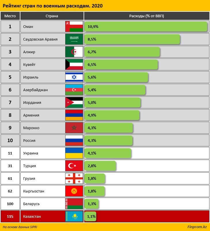 Так, уровень расходов РК на оборону от ВВП в 2020 году составил 1,1%, в то время как Армения заняла 8-е место в мире (4,9% от ВВП), Россия – 10-е место (4,3%), Кыргызстан – 62-е место (1,8%), Беларусь – 100-е место (1,3%). Среди стран СНГ высокие показатели демонстрируют также Азербайджан (5,4% от ВВП), Украина (4,1%) и Грузия (1,8%).