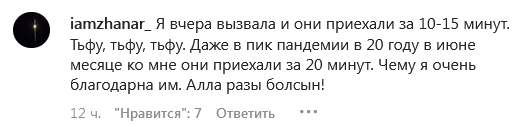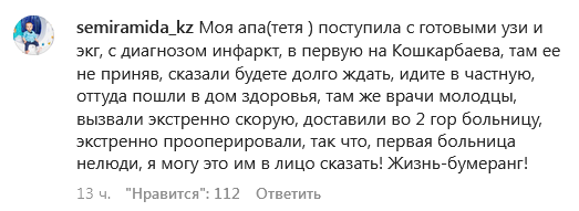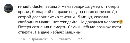 "В 22.20 моего мужа покусал алабай, мы вызвали скорую. Прождали ее 45 минут, никто не приехал. Поехали самообращением в многопрофильную больницу №1 по Кошкарбаева, его не приняли, ссылаясь на то, что прописки нет, хотя у нас тут своя квартира и мы все прописаны тут. Вышли на улицу и начали опять звонить в скорую, они нам сказали, свободных машин нет, ожидайте 2-3 часа. У меня просто нет слов, сидим и не знаем, куда обращаться. Неужели экстренных машин нет в запасе. Как это все вообще понимать. Столько крови потерял, пока это все происходило", — говорится в сообщении.