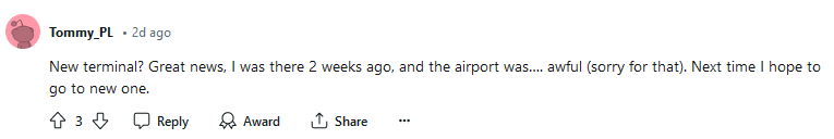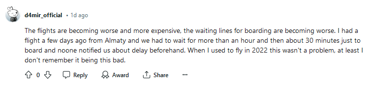Изменится ли ситуация с открытием нового международного терминала, покажет только время. Но на это надеются все, потому что условия в алматинском аэропорту производят неприятное впечатление на очень многих путешественников. И они откровенно делятся своим недовольством, сравнивая воздушную гавань с «загоном» и «автовокзалом», сообщает Сaravan.kz.
