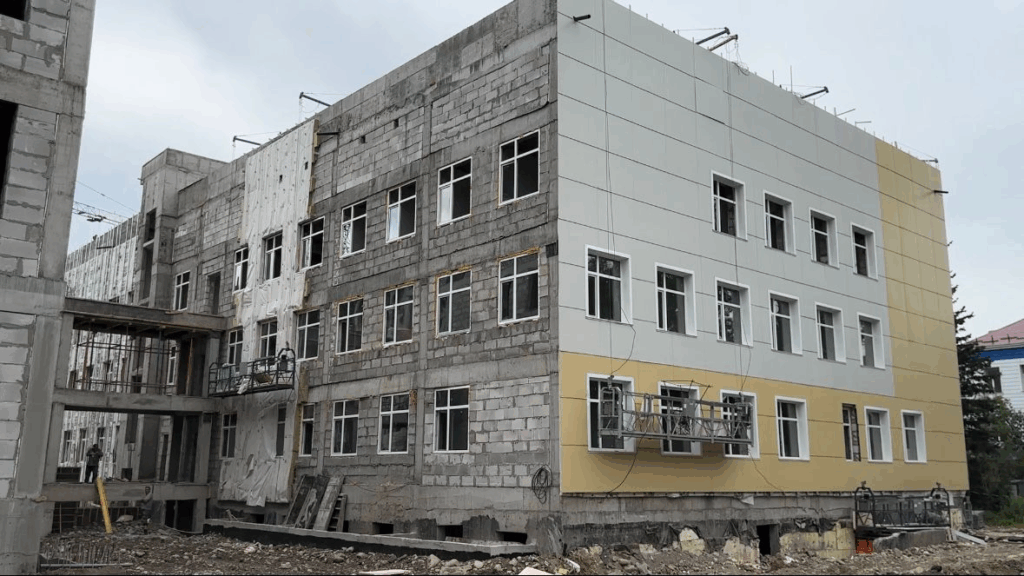 • Поликлиника: 85% (завершены каркас и фасад, завершаются внутренние отделочные работы, установка сантехнического оборудования, обустройство входной группы);
