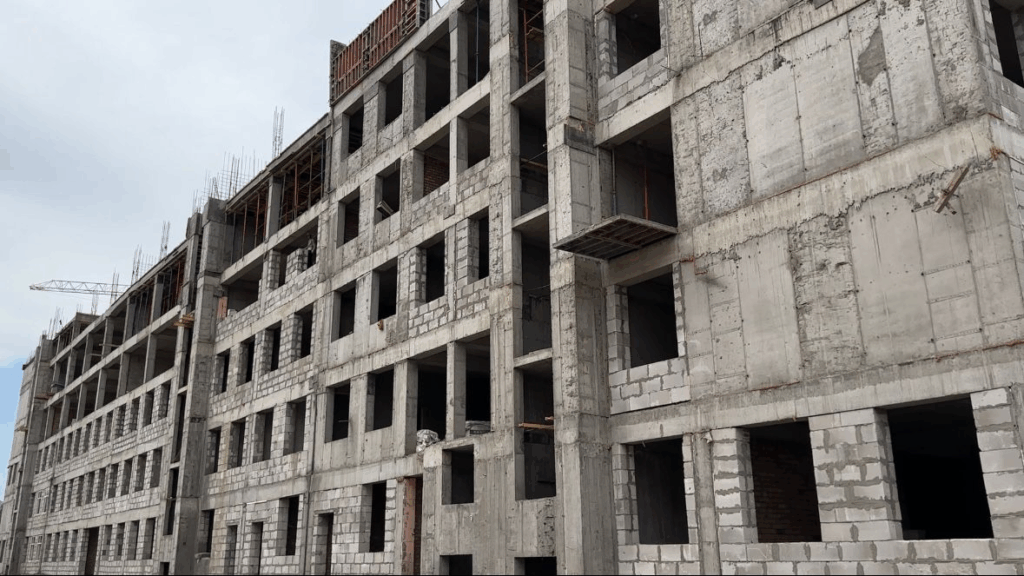 • Стационар: 40% (полностью завершён блок Б — 3 этажа, в блоке А (5 этажей) — выполнено 60% работ; продолжаются монолитные работы, кладка наружных стен, монтаж перегородок, начаты отделочные и фасадные работы);
