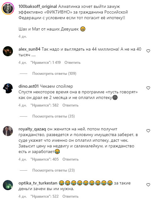 «В связи с ситуацией готова выйти замуж фиктивно за гражданина Российской Федерации, с условием, что он оплатит ипотеку в 44 миллиона тенге и будет проживать в моей квартире до Нового года. Рассмотрю все варианты», — сказала девушка.