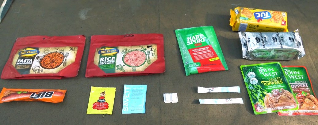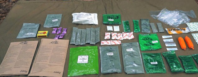 Две банки каши с мясом — пшенная и гречневая. Баночка щей с говядиной, тушёнка, немного овощного рагу и гора галет. В холодном виде есть можно только рагу и галеты. Жира в консервах не пожалели, и даже летом он покрывает содержимое толстым слоем. Для разогрева есть одноразовый таганок, охотничьи спички и таблетка сухого спирта. В полевых условиях возиться с этим не всегда удобно, особенно в наших, принизываемых ветром, степях. Но и при отсутствии ветра манипуляции с таганком отнимают драгоценные минуты отдыха. Так что перекусить на ходу, когда на привал дано 5-10 минут, можно лишь галетами. Хорошо хоть консервные банки с ключом, и таскать с собой консервный нож не нужно. Ещё из плюсов — сортировка приёмов пищи по отдельным пакетам. Так консервы после вскрытия пакета не рассыплются по всему рюкзаку. Правда, основной пакет слишком громоздок для небольшого солдатского вещмешка, и при долгих переходах продукты там болтаются, создавая дополнительные неудобства.