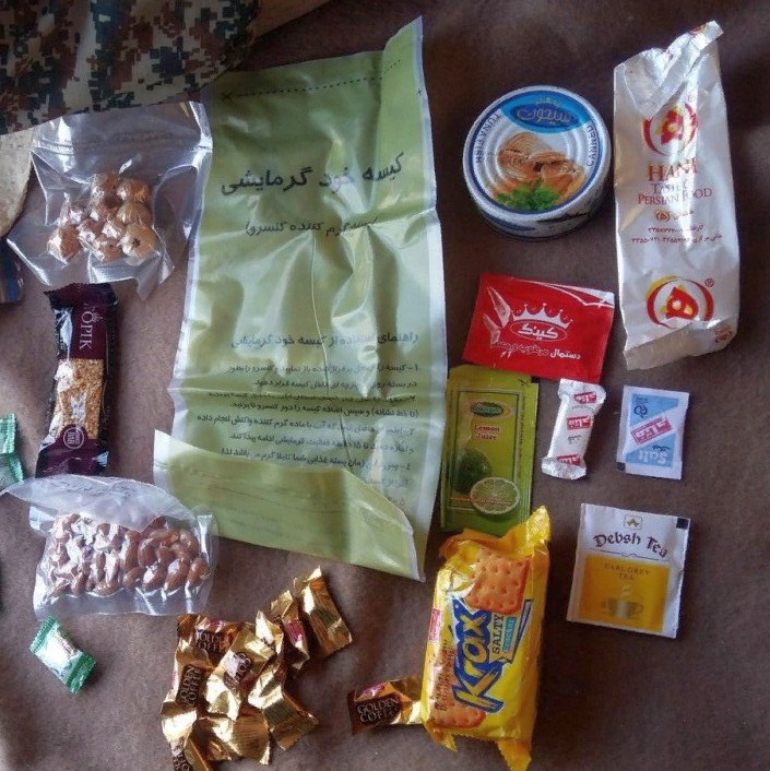 Иранский сухпай намного скромнее. Эта самый скудный ИРП из тех, что удалось найти. Он рассчитан на один приём пищи. Состоит из пачки галет, банки консервированного тунца и горсти миндаля, конфеток и фиников. Зачем-то в иранский паёк сунули пакет для разогрева. Такое ощущение, что сухпай разрабатывала не армия, а сам солдат сунул в пакет то, что попалось под руку.