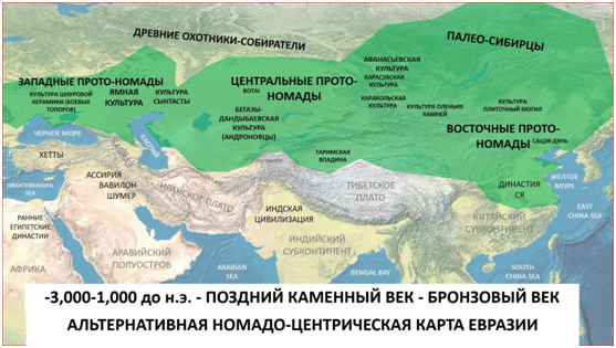 Западные протокочевники зашли и в Восточную Степь. Более продвинутые пришельцы передавали местному населению древних азиатских охотников-собирателей технологии колесного транспорта, коневодства и бронзовой металлургии. Так возникли столь известные явления, как культуры оленьих камней и плиточных могил — то есть восточные протокочевники.