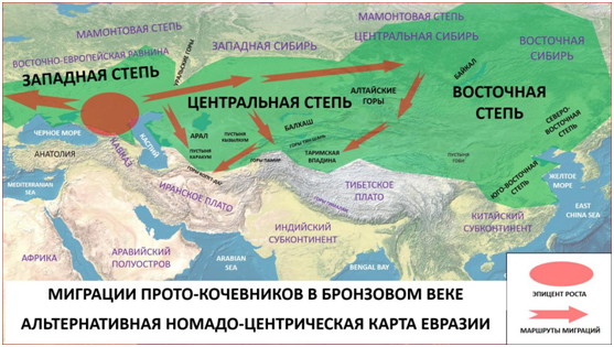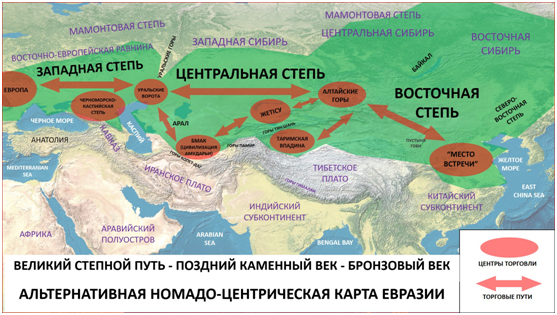 Великий Степной путь на востоке начинался в “Месте Встречи” в Восточной Степи, проходил через важный торговый хаб в Алтайских горах, откуда маршруты шли в Таримскую впадину, а в Центральной Степи — в регионы Жетісу (Семиречье) и далее БМАК (Бактриано-Маргианский археологический комплекс, он же Амударьинская цивилизация). Из Центральной Степи через Уральские ворота торговые пути вели в Западную Степь — в Черноморско-Каспийскую равнину, и наконец, далее в Западную Европу. Благодаря великому Степному пути уже 4-3 тысячи лет назад территории современной Кореи и Северного Китая были связаны со Средней Азией и Западной Европой. Степь была готова к следующему мощному рывку.