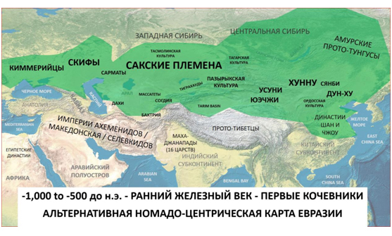 В это же время кочевая цивилизация Великой Степи сделала еще один мощный технологический рывок — одной из первых в мире быстро освоила железную металлургию — и массово вступила в железный век. Что очень сильно увеличило возможности теперь уже настоящих ранних кочевников. Транспортные телеги протокочевников эволюционировали в мобильные платформы, на которых устанавливали легкие жилища, и в таком виде целые племена жили и путешествовали по степям и равнинам, “не слезая с колес”.