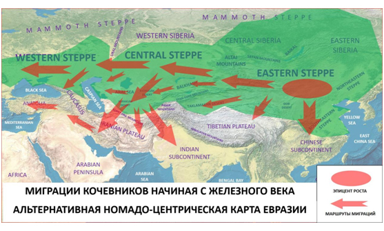 Примерно в этот период прекратился поток миграции степных народов с запада на восток и начался обратный поток движения кочевников с востока на запад. Этот поток определил будущее кочевой цивилизации на грядущие два с половиной тысячелетия. С этого момента Восточная Степь стала непрестанным поставщиком “свежей крови” в семью народов Великой Степи — все новые народы зарождались, оформлялись и накапливались здесь, а потом выплескивались на юг в Центральную Степь и далее на запад, о чем будет рассказано в следущей части.