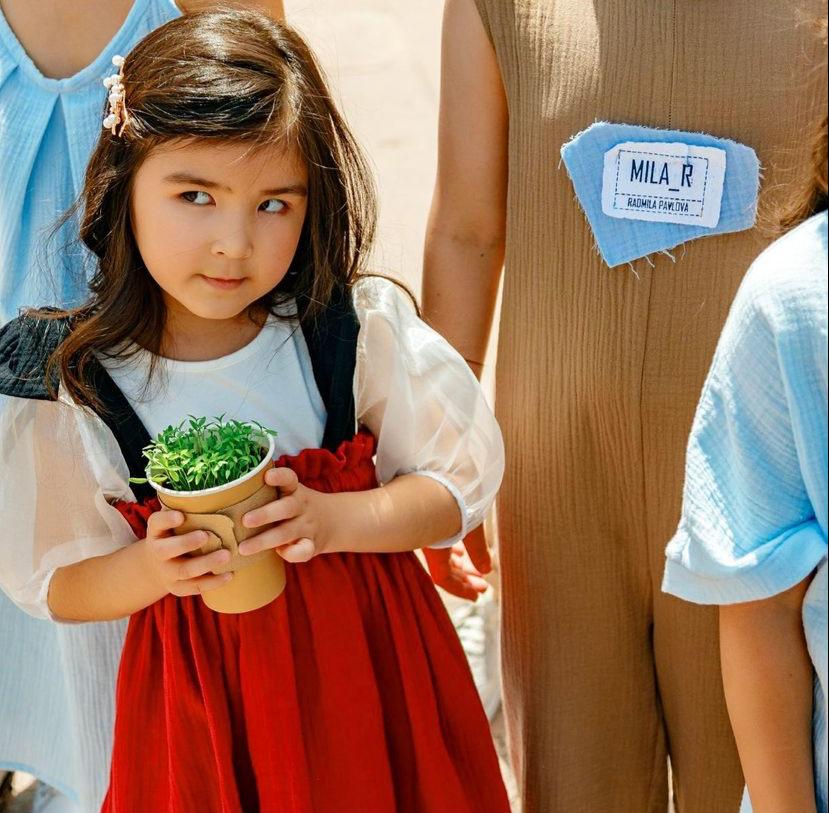 — Также одним из акцентов показа стало растение, посаженное в стаканчик из-под кофе. Хочется напомнить этим, что такие стаканчики занимают первые места по загрязнению окружающей среды, и тем самым мы предлагаем использовать их вторично. Детям эта идея очень понравилась. Они с большим интересом изучали растение в стаканчике, — делится дизайнер.
