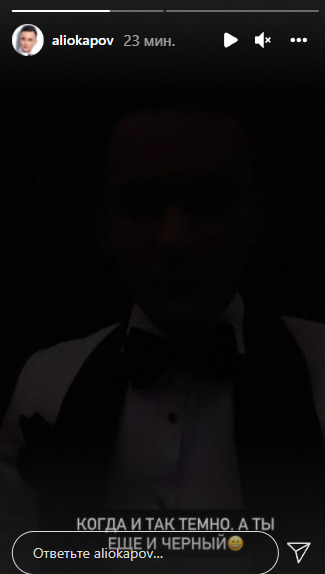 Сын народной артистки выложил фотографию, на которой он стоит в темноте, и хорошо видно только белый костюм. Окапов подписал её: "Когда и так темно, а ты еще и черный".