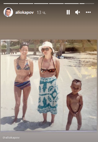 Артист выложил несколько фотографий, на которых он ещё ребёнок. На всех он с матерью, ещё молодой народной артисткой Розой Рымбаевой. На пляже маленький Али стоит без одежды.